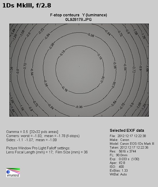 When it comes to full frame you can see serious vignetting problems only at the maximum relative aperture, where the brightness loss in the corners amounts to as much as 46% (-1.78 EV).