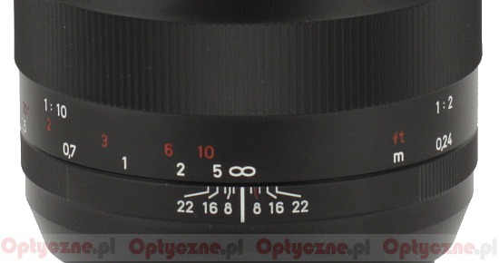 A depth of field scale, positioned on the casing of the lens, help you with the focusing.