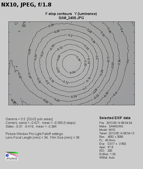 Of course we would be hard-pressed to believe in such great results so we checked the situation in RAW files. It happened the values were just 2% higher so as unreal as those reached in JPEGs. It seems the body of Samsung tries to correct the vignetting of the lens even if it doesn’t have that particular lens’s specifications in its database.