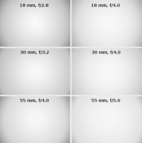 Similar situation can be observed in the middle of the focal range. By f/3.2 the brightness loss in frame corners is 11% (-0.35 EV), on stopping down to f/4.0 it increases to 13% (-0.40 EV) and by f/5.6 it decreases to 9% (-0.29).