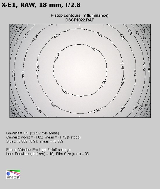 As you see the problems are really negligible. At 18 mm focal length and by f/2.8 the vignetting reaches a slight level of 13% (-0.41 EV). The result by f/4.0, amounting to 15% (-0.48 EV) so a tad higher, proves that the aberration is corrected there; if there was no interference, according to physical laws with the stopping down the vignetting was bound to decrease. At 18 mm focal length we don’t observe such a thing.