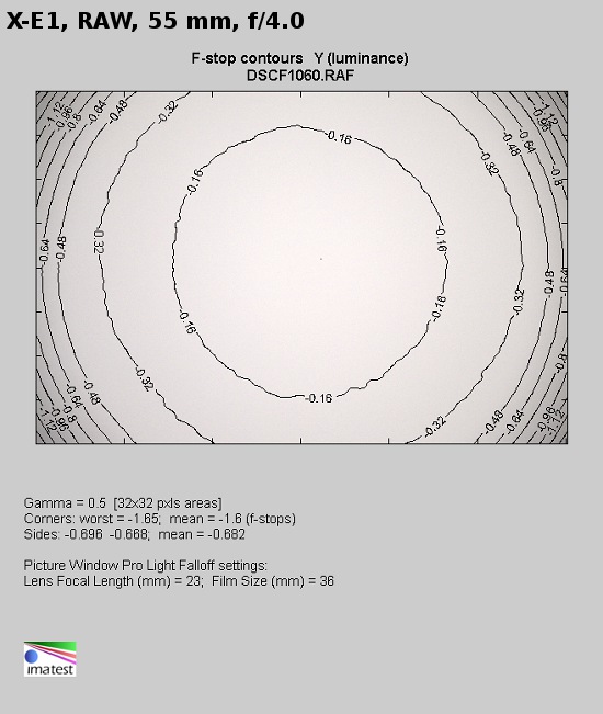 At 55 mm the vignetting increases again. At the maximum relative aperture it is 42% (-1.60 EV) and it decreases to 28% (-0.94 EV) by f/5.6. When it comes to f/8.0 and f/11.0 relative apertures the vignetting amounts to 21% (-0.69 EV) and 15% (-0.49 EV) respectively.