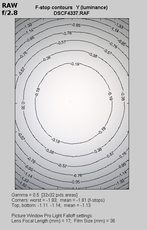 In the case of JPEG files at the maximum relative aperture you must take into account the loss of 23% of light (-0.74 EV) in the frame corners. It is a moderate value which decreases to low by f/4.0, reaching 18% (-0.59 EV). By f/5.6 and f/8.0 it is already almost imperceptible, amounting to 13% (-0.40 EV) and 10% (-0.30 EV) respectively.