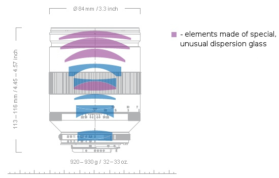 The tested lens consists of 11 elements positioned in 8 groups. As much as four elements were made of special, unusual dispersion glass which is supposed to ensure a perfect chromatic aberration correction. Inside you can also find a circular aperture with nine diaphragm blades which can be closed down to a value of f/22. Of course you cannot omit the high quality T* anti-reflection coatings which cover all air-to-glass surfaces.