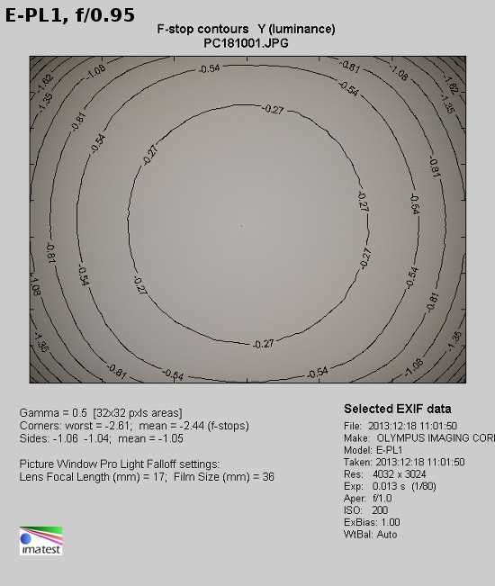 At the maximum relative aperture you deal with a huge value of 57%(−2.44 EV). On stopping down to f/1.4 the vignetting decreases to 38% (−1.40 EV) – it is a result by 11% better than that of the PanaLeica. The light fall-off in the corners becomes moderate by f/2.0, where it reaches 16% (−0.50 EV), and it stops being a problem by f/2.8 where it is just 5% (−0.14 EV). Both these results are by several percent better than the results we got with the significantly bigger Leica 1.2/42.5.