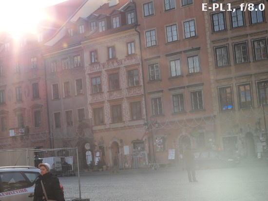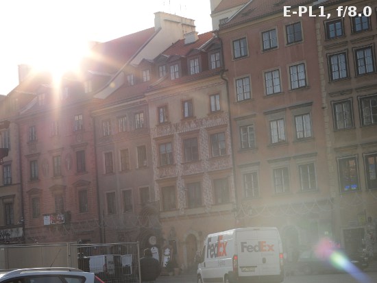 Work against bright light is neither a strong point of the tested lens nor its biggest flaw. Flares can be seen only when the sun is situated firmly inside the frame. Then, no matter what aperture you employ, you can notice distinct, colourful artifacts. When you move the sun near the very corner or just outside the frame the flares fade out although the contrast decrease remains still noticeable. In this category the PanaLeica 1.2/42.5 fared noticeably better.