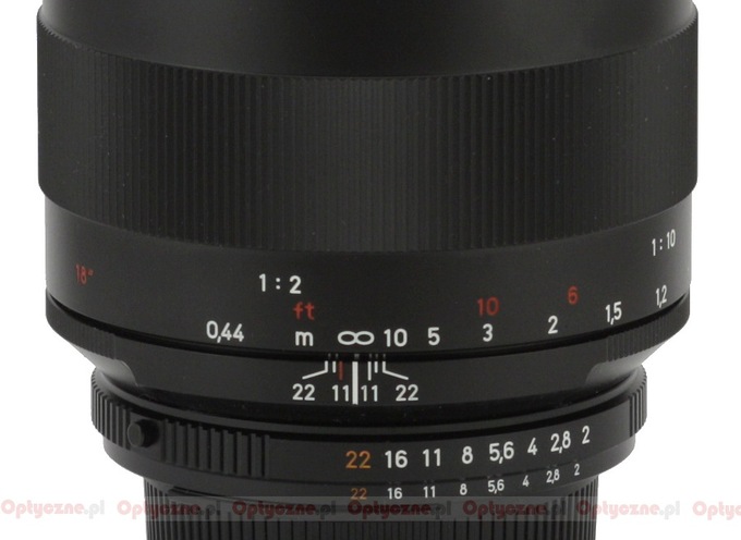 The Carl Zeiss Makro-Planar T* 100 mm f/2 is a manual device which means you control the focus with your finger tips. As it befits a good quality lens you get here a huge and comfortable focus ring with a large rotation angle – that of 360 degrees. It is worth mentioning that you deal here with a macro lens, able to focus from 0.44 of a meter while the minimum focusing distance of classic 85-135 mm lenses amounts to about 1 meter. In the case of the Zeiss most of the ring movement covers the macro range: passing from infinity to 1 meter takes a turn through 90 degrees and the rest 270 degrees control a very slight range from 1 to 0.44 of a meter.