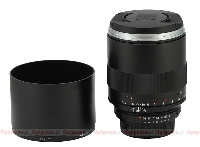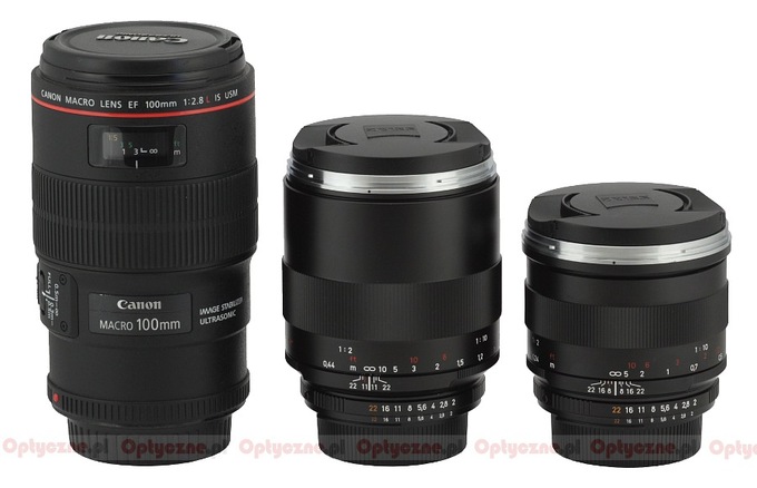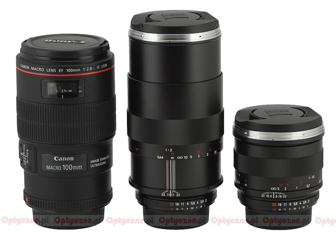 In the photo below the tested Zeiss is positioned next to the Canon EF 100 mm f/2.8L Macro USM IS and the Makro-Planar 50 mm f/2.0. As you can notice the Zeiss, despite a better aperture fastness, is distinctly smaller than the Canon.