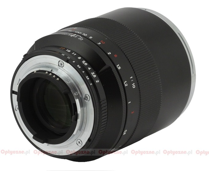 The tested lens starts with a metal mounting plate with contacts (the ZF.2 version) which surrounds a rear element, 28 mm in diameter. With the focus set at infinity the rear element is hidden about 1 cm deep inside the casing. After passing to the minimum focusing distance the element hides almost 3.5 cm inside. The overall dimension of the lens increases by about three centimeters as well when you want to use 1:2 image scale.
