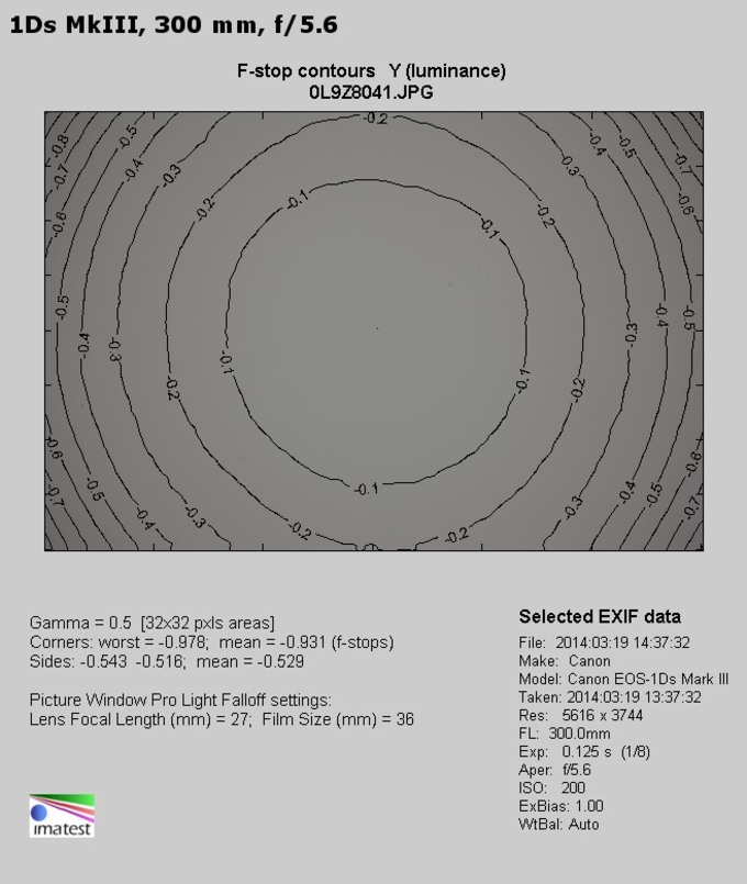A bit better situation can be seen at 300 mm focal length. At the maximum relative aperture the light fall-off in the corners gets to 28% (-0.93 EV) and it decreases to 12% (-0.36 EV) by f/8.0. By f/11 the vignetting becomes imperceptible, amounting to just 5% (-0.16 EV).