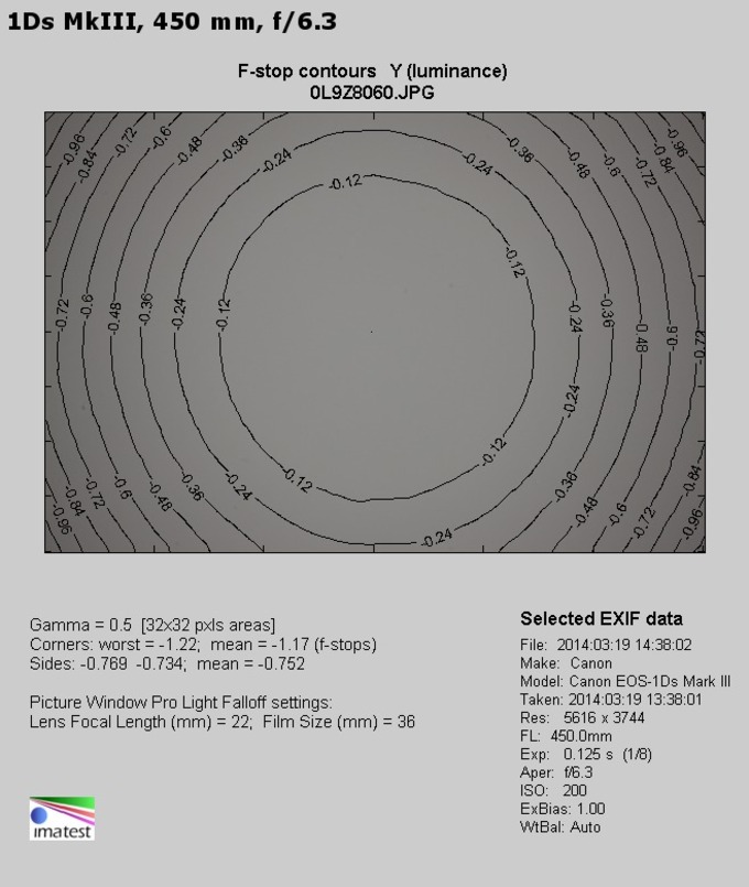 At 300 mm focal length there are even less problems – at the maximum relative aperture the vignetting amounts to just 12 % (-0.37 EV) and it decreases to 6% (-0.18 EV) by f/8.0. A similar situation can be observed at 450 mm. By f/6.3 the vignetting is 15% (-0.46 EV) and it decreases to 7% (-0.21 EV) by f/8.0.