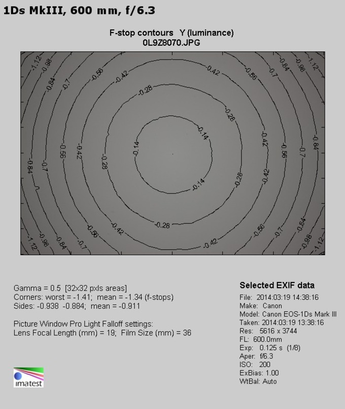 At 600 mm and with the lens wide open you must take into account the loss of 37% of light (-1.34 EV) in the frame corners. By f/8.0 that aberration is still noticeable (but decreasing to a moderate level) as it reaches 22% (-0.70 EV). The problems disappear only by f/11 and f/16 where the vignetting is respectively 12% (−0.39 EV) and 5% (−0.14 EV).