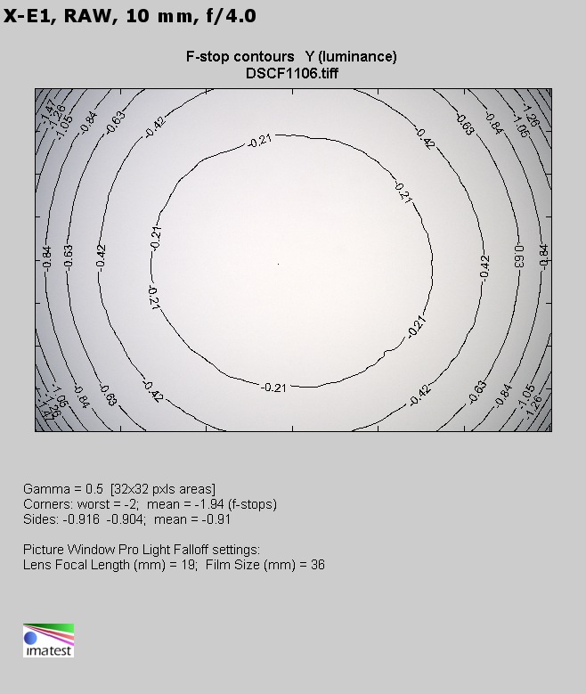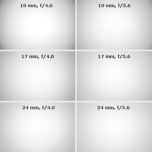 At a very difficult combination of 10 mm focal range and f/4.0 aperture the vignetting reaches a level as high as 49% (-1.93 EV). It is a very high value. By f/5.6 the aberration decreases to 38% (-1.38 EV) and by f/8.0 it drops to 33% (-1.16 EV). Further stopping down lowers its level by 1% at most. Still you should notice one fact: the light fall-off gradient on the very edge is really high - only the corners seem to be very dark. As a result, after distortion correction and cropping the image to the size of JPEG files, the vignetting might prove to be a much less serious problem than it appears at first.