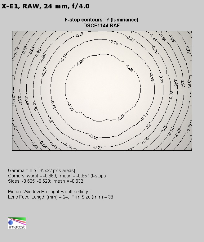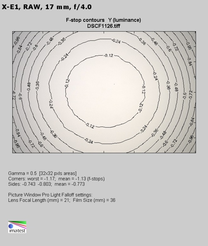 In the middle of the focal range the vignetting is 32% (-1.13 EV). That level is significant and easy to spot but not as bothersome as the result we got at 10 mm. On stopping down to f/5.6 that aberration decreases to 26% (-0.89 EV) and by f/8.0 it reaches 25% (-0.83 EV).
