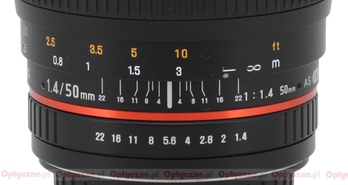 The tested lens is a manual device so the focus can only be set by using a wide and comfortable ring you can find on its barrel; the ring’s work, however, is beyond reproach. It is a bit of a pity that Samyang didn’t fit the lens with even the simplest “screwdriver” which would allow an automatic focusing on more advanced Nikon reflex cameras or Pentax and Sony bodies. The lack of autofocus is not keenly felt in case of wide angle instruments which constitute the majority of Samyang’s line-up, but in a case of a fast prime the autofocus can often improve the shooting significantly. Additionally, the Canon mount version of the lens doesn’t have any contacts so there’s no focus confirmation option available.