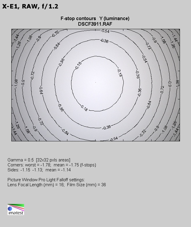 In JPEG files its level is noticeable only by f/1.2, f/1.4 and f/2.0, amounting respectively to 24% (−0.80 EV), 17% (−0.53 EV) and 16% (−0.50 EV). By f/2.8 the problem disappears almost completely, reaching just 5% (-0.16 EV).
