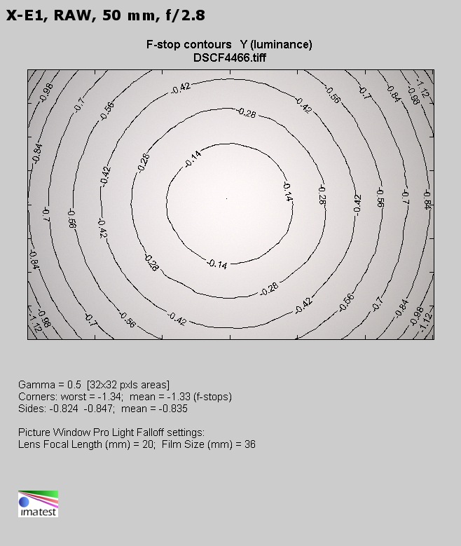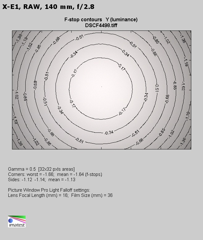 The fewest problems you encounter at the shortest focal length but even there, at the maximum relative aperture, the vignetting is clearly visible, amounting to 37% (−1.33 EV). That aberration decreases to 21% (-0.67 EV) after applying f/4.0. The problem becomes negligible by f/5.6 and f/8.0 where it is respectively 14% (−0.44 EV) and 9% (−0.26 EV).