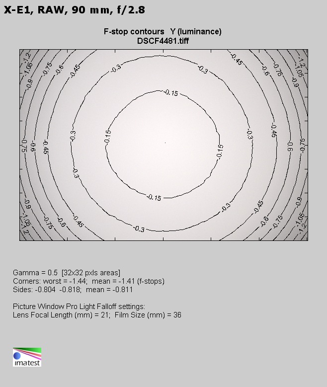 At 50 mm focal length and with the lens wide open the brightness loss in the frame corners reaches just 12% (−0.39 EV), decreasing to an imperceptible level of 10% (−0.29 EV) on stopping down the aperture to f/4.0. For the combination of 90 mm focal length and f/2.8 aperture the vignetting is 14% (−0.44 EV). On stopping down to f/4.0 and f/5.6 it decreases to respectively: 12% (−0.38 EV) and 10% (−0.31 EV).