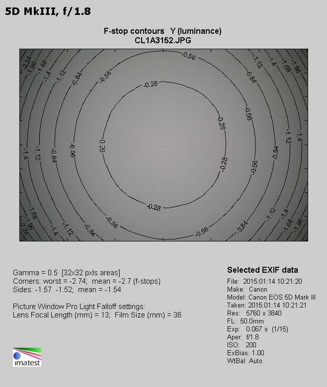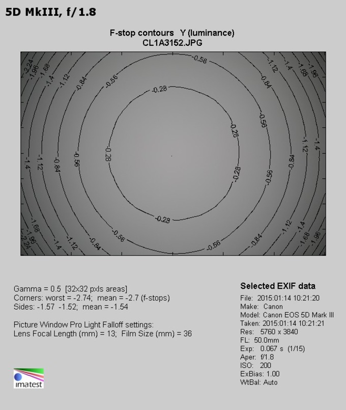 The vignetting can be noticed only near the maximum relative aperture. By f/1.8 it amounts to 22% (-0.73 EV) and it decreases to 18% (-0.59 EV) after employing f/2.0. After stopping down the lens to f/2.8 the vignetting isn’t bothersome at all, reaching just 7% (-0.20 EV). It’s worth noticing these results are by 1-3% lower than those of the Canon EF 50 mm f/1.8 II.