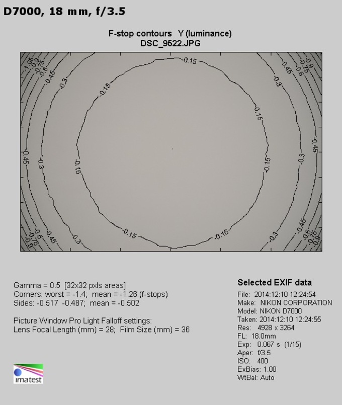 At a difficult combination of the maximum relative aperture and the shortest focal length the vignetting amounts to 35% (−1.26 EV). What’s interesting it is a better result than that of the bigger, heavier predecessor which vignetting with the same combination of parameters was 41%. On stopping down the aperture to f/4.0 the vignetting decreases to 32% (−1.11 EV). A noticeable drop of this aberration’s level can be noticed only by f/5.6 where it gets to 19% (−0.63 EV). By f/8.0 and f/11 the brightness loss amounts to respectively 15% (−0.46 EV) and 14% (−0.44 EV).