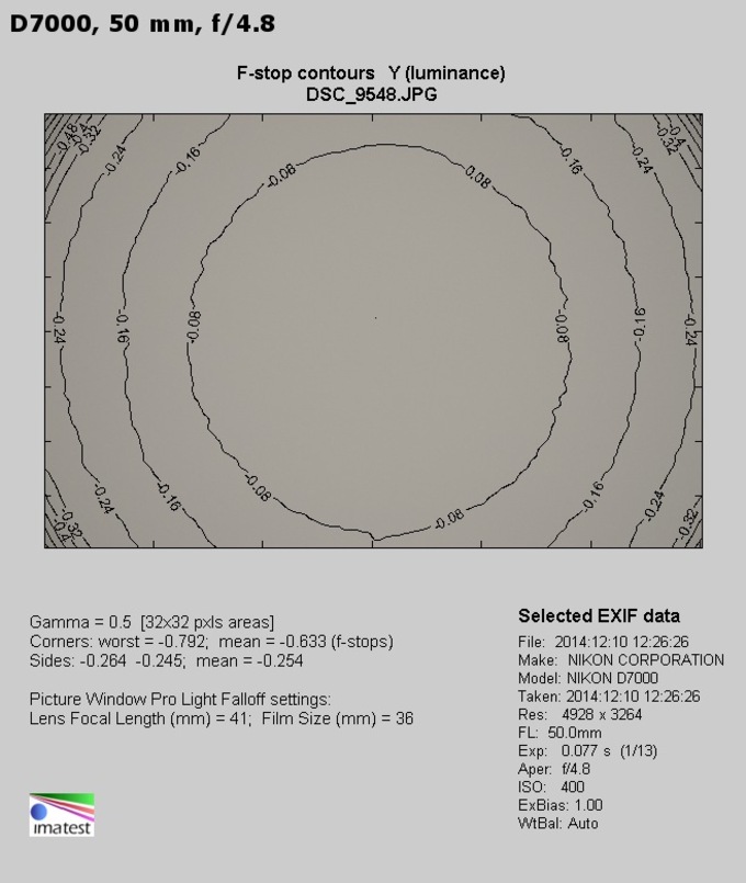 A much better situation can be observed at 50 mm focal length where, at the maximum relative aperture, you must take into account the loss of 20% (−0.63 EV) of light in the frame corners. Stopping down the aperture to f/5.6 you can decrease the vignetting to 14% (−0.45 EV). That aberration becomes imperceptible by f/8.0 where it reaches just 8% (−0.24 EV).