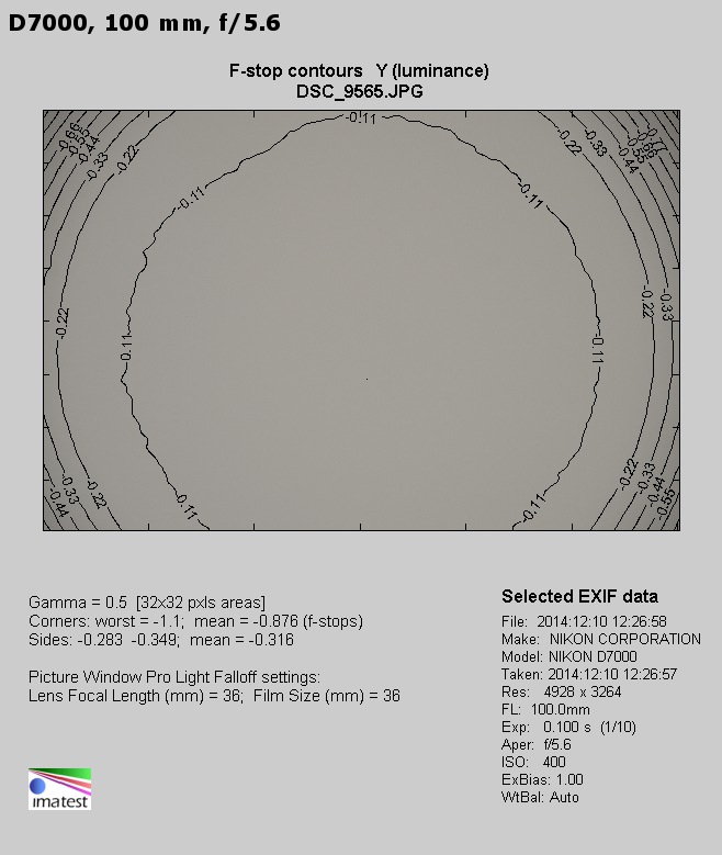 After passing to 100 mm focal length you can observe a slight vignetting increase. By f/5.6 that aberration goes to 26% (−0.88 EV), by f/8.0 it is 16% (−0.49 EV) and by f/11 it drops to an almost imperceptible level of 10% (−0.31 EV). Here the advantage of the rival is clear as in the 50-100 mm range it didn’t have any vignetting at all, with the results hovering between 9 and 16%.