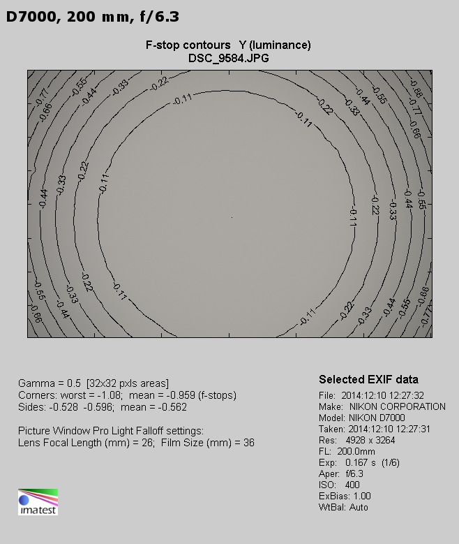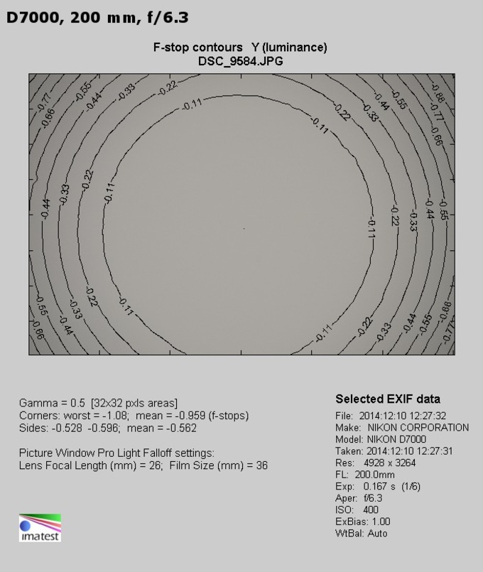 At 200 mm focal length you can still observe moderate vignetting values. Applying the maximum relative aperture you have to take into account losses of about 28% (−0.96 EV) of light which decrease to 20% (−0.66 EV) on stopping down to f/8.0. At f/11 and f/16 apertures the vignetting results are respectively 13% (−0.41 EV) and 7% (−0.21 EV). These values are very similar to those we got in the case of the lens’s predecessor.