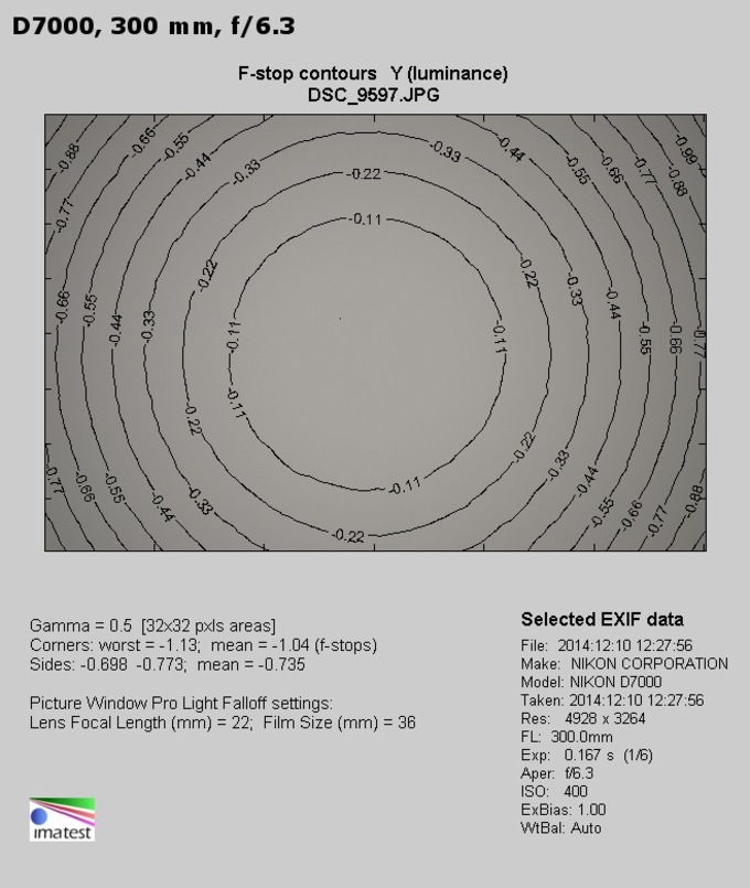 The maximum focal length means another vignetting increase – fortunately it is not that big. At the maximum relative aperture that aberration amounts to 30% (−1.04 EV) and once again it is a value almost the same as that of the Nikkor’s predecessor. By f/8.0 the vignetting is 21% (−0.67 EV), and by f/11 it reaches 13% (−0.41 EV). The aberration becomes completely imperceptible only by f/16 where it gets to 6% (−0.19 EV).