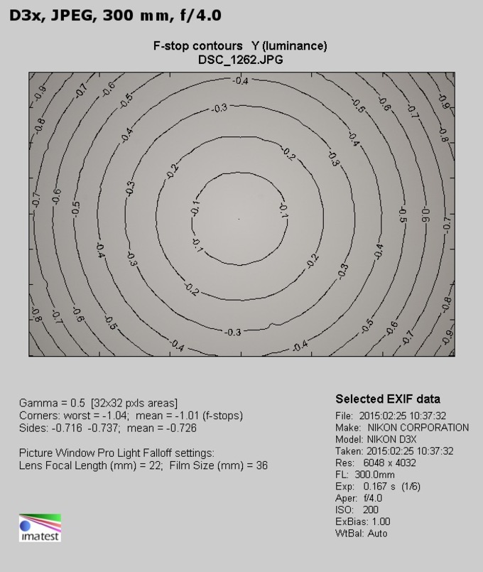 It seems the results are very similar. At the maximum relative aperture the vignetting might still be a bit bothersome, reaching 29% (−1.01EV), but already by f/5.6 it becomes slight, amounting to 15% (−0.47 EV), and by f/8.0 it disappears completely (9%).