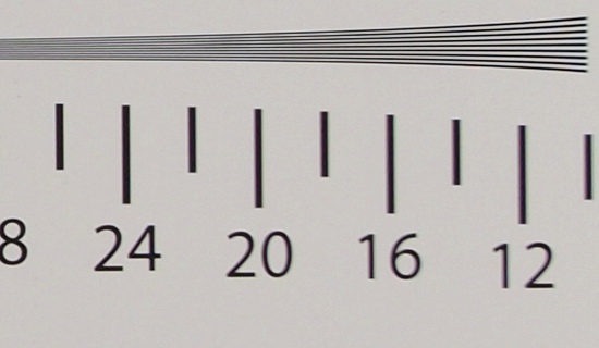 The edge of the frame is quite another matter. Due to joint forces of huge field curvature and badly corrected off-axis aberrations the images near the maximum relative aperture are of dreadfully low quality. If you want to take a shot from a close distance you see nothing in the frame. The 1:1 crops, shown below, taken from the upper left-hand corner of the photos of our A0 and A2 format charts, prove that much very clearly.