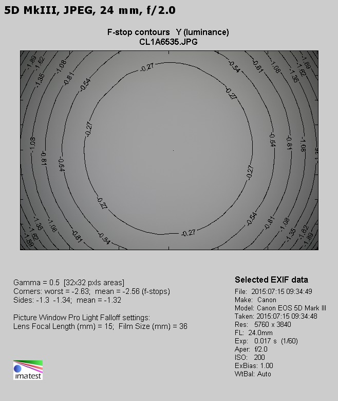 As you can see the problems are really distinct here. At a difficult combination of 24 mm and f/2.0 the light fall-off in the frame corners amounts to 59% (−2.56 EV) – it is really a very high value. On stopping down the aperture to f/2.8 it decreases to 37% (−1.32 EV). Only after employing f/4.0 the aberration becomes moderate, getting to 22% (−0.73 EV). By f/5.6 and f/8.0 the vignetting level is already low but still noticeable; our measurements provided the following values: 16% (−0.52 EV) and 14% (−0.44 EV).