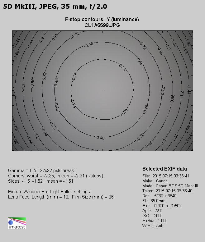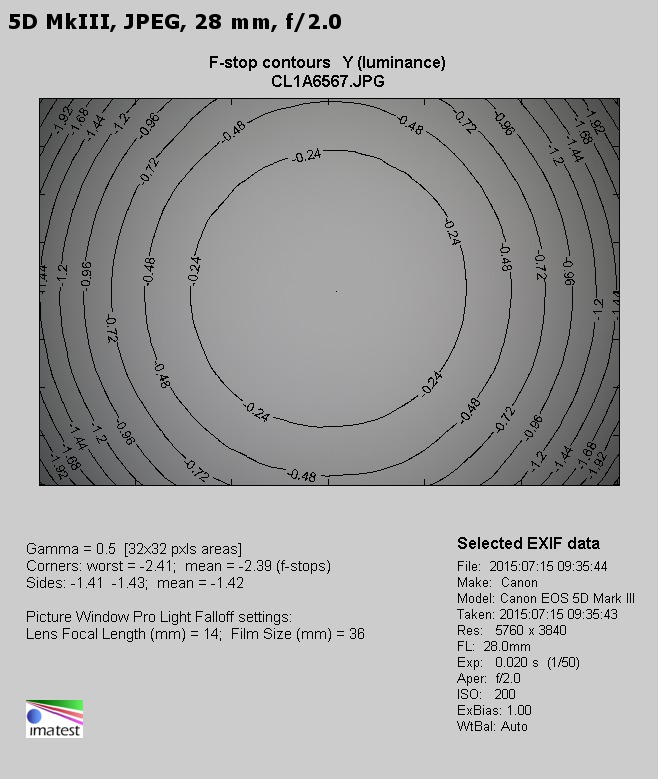 You can complain about the Sigma’s 24–35 mm vignetting and it completely deserves to be criticized here; still you should also keep in mind the performance of other lenses. For instance the vignetting of the Canon 2/35 IS at the maximum relative aperture reaches a huge value of 66% (over 3 EV!). The Nikkor AF-S 28 mm f/1.8G, when stopped down slightly to f/2.0, loses 48% of light in the corners so is better than the Sigma by just 8%.