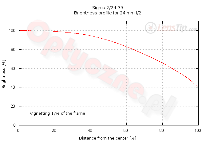 The vignetting can be noticed by and large only at the maximum relative aperture. At 24, 28 and 35 mm focal lengths it amounts to, respectively, 17% (−0.52 EV), 20% (−0.63 EV) and 23% (−0.76 EV). On stopping down the lens to f/2.8 the problem disappears almost completely, fluctuating between 6% (−0.18 EV) at 24 mm and 9% (−0.26 EV) at the 35 mm focal length.