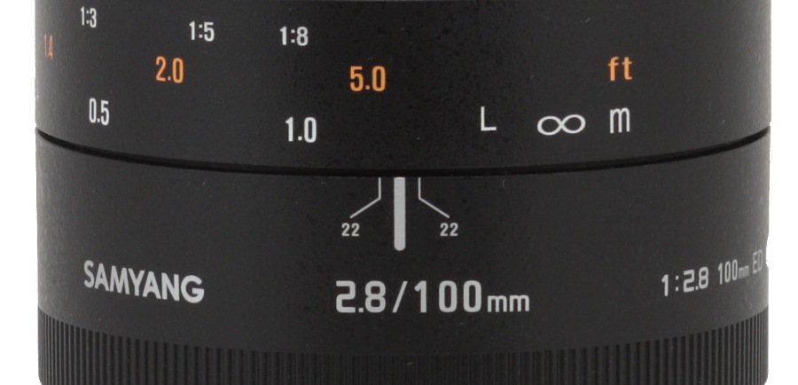 In the case of the Samyang 2.8/100 you set the focus using a big and comfortable ring, with the help of a depth of field scale positioned on the barrel. To be completely honest that scale is good for nothing as it contains marks only at f/22 and they are positioned very close together.