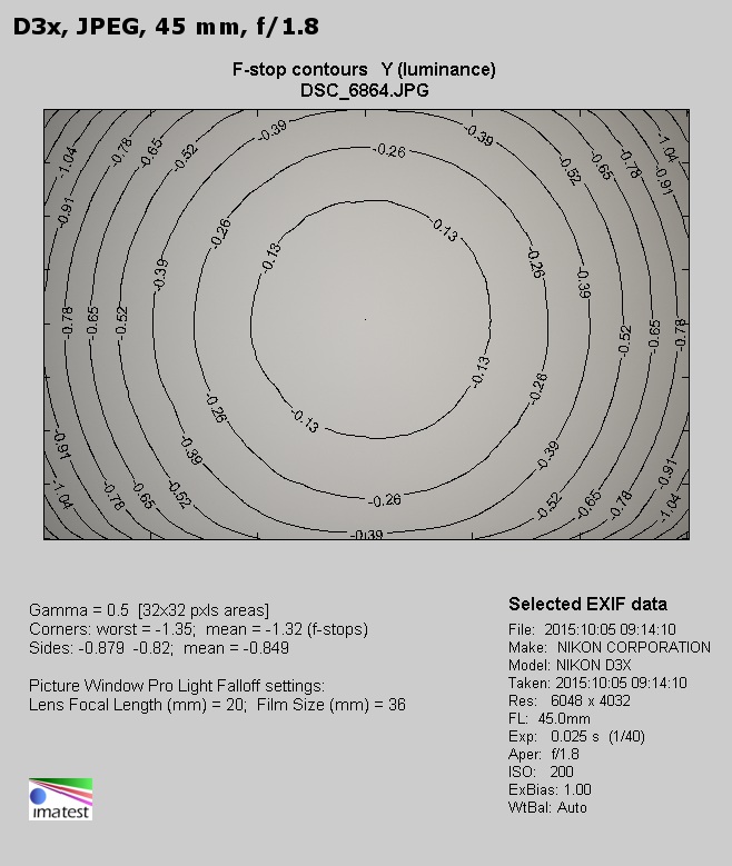 When you stop down the aperture to f/2.0, the vignetting decreases to 32% (−1.10 EV). The aberration becomes low already by f/2.8 where it is just 17% (−0.54 EV) and it is practically imperceptible by f/4.0 (10% and −0.31 EV).