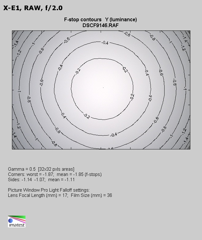 When you stop down the aperture to f/2.8 the vignetting decreases to 29% (−1.01 EV) and by f/4.0 it falls to a level of 22% (−0.73 EV). Further vignetting drop along with the stopping down is slight. By f/5.6 that aberration reaches 20% (−0.66 EV) and by f/8.0 it amounts to 18% (−0.56 EV). Some chance to notice the light fall-off you get even by f/11 where it gets to 14% (−0.46 EV).