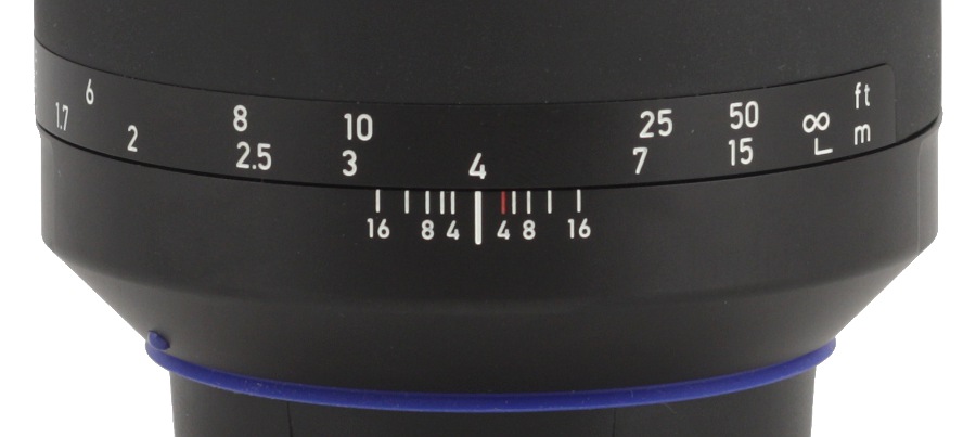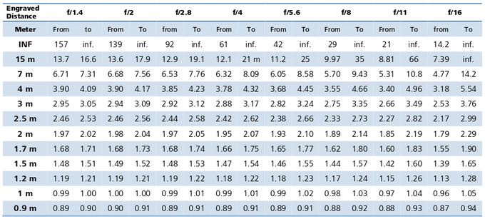 In the catalogue dedicated to the tested lens you find a depth of field chart as the one we show below, computed for a circle of confusion amounting to 0.033 mm.