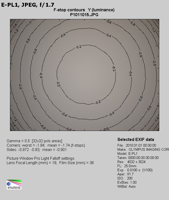 You can notice the vignetting without any problems at the maximum relative aperture because it reaches 45% (−1.74 EV). It is a high level but still lower than that of the slower Olympus 1.8/25. On the other hand some 1.8/50 class lenses designed for smaller sensors can have a lower vignetting level so the result of the Panasonic is nothing to be proud of.