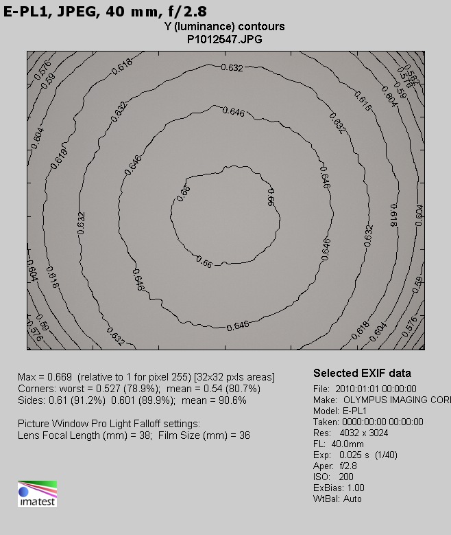 At shorter focal lengths the tested lens has no vignetting-related problems whatsoever. The combination of 40 mm and the f/2.8 aperture means that you lose 19% (−0.62 EV) of brightness in the frame corners; that aberration becomes completely imperceptible on stopping down the aperture to f/4.0 where the value, measured by us, amounted to just 3% (−0.08 EV).