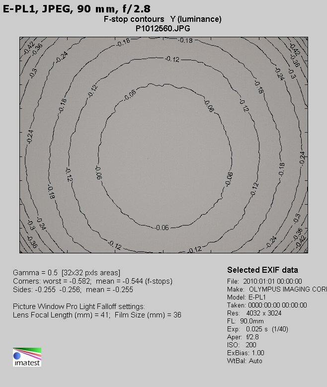 A very similar situation can be observed at 90 mm. At the maximum relative aperture you must take into account the vignetting of 17% (−0.54 EV) which decreases to just 2% (−0.07 EV) on stopping down the lens to f/4.0.