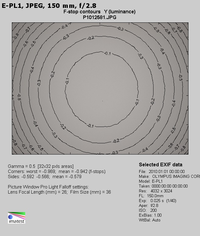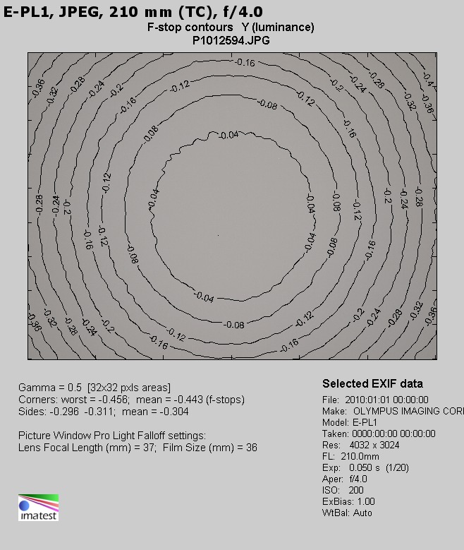 After attaching the teleconverter the situation improves. At the maximum relative aperture which, in that case, amounts to f/4.0 the vignetting is just 14% (−0.44 EV) and then it decreases to a quite symbolic level of 1% (−0.02 EV) by f/5.6.