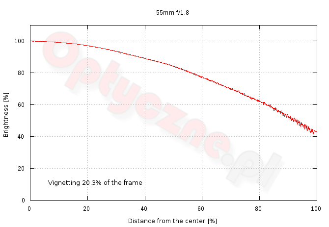 The vignetting of the Sonnar 1.8/55 FE decreases quite slowly on stopping down. By f/2.0 it amounts to 53% (−2.18 EV), and by f/2.8 it still remains noticeable, getting to 35% (−1.25 EV). That last result is the worst in the whole group, worse even than the performance of the Canon EF 50 mm f/1.8 STM, a device we criticized harshly in this category.