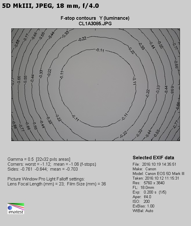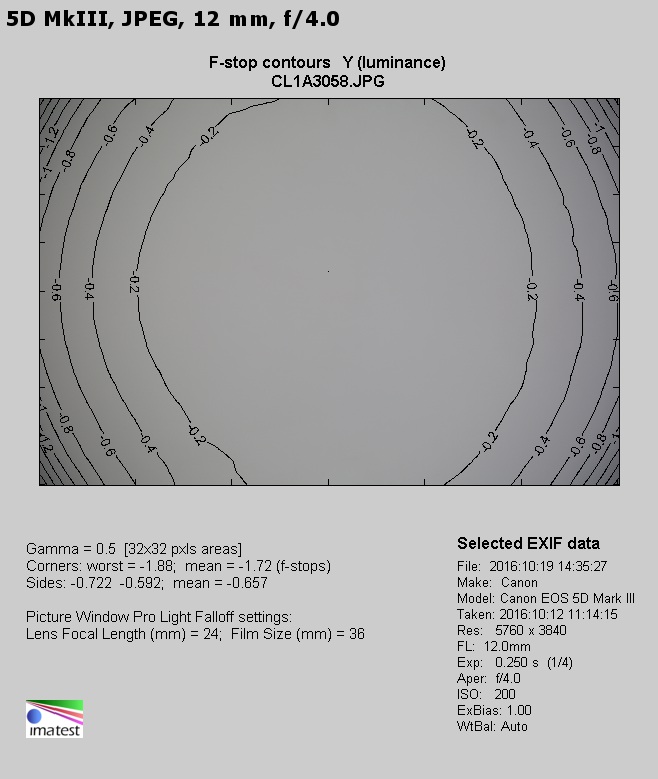 Those results are a very positive surprise. At the very difficult combination of 12 mm and f/4.0 there is no vignetting at all – the level we got amounted to just 9% (−0.28 EV) and it decreased to 7% (−0.22 EV) on stopping down the aperture to f/5.6.