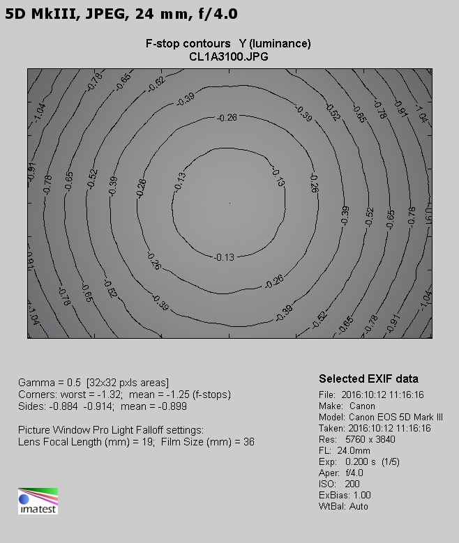 The maximum focal length seems to be the only place where the Canon can compete with the Sigma successfully in this category. By f/4.0 the Canon had a result of 32% and the result of the Sigma was by 3% higher (−1.25 EV). Still already by f/5.6 the vignetting level of the Sigma becomes moderate reaching 23% (−0.74 EV) and then, on stopping down to f/8.0 and f/11, it decreases to 16% (−0.52 EV).