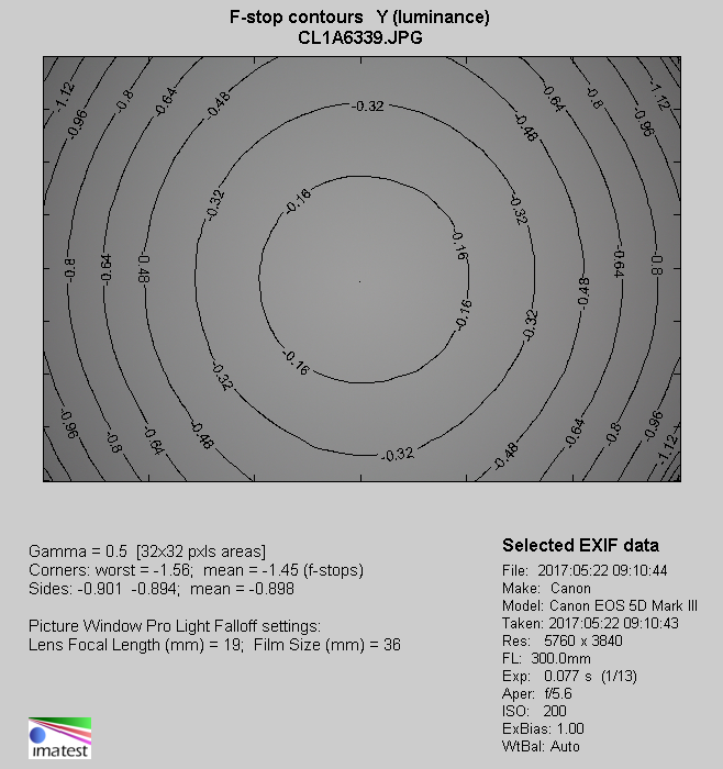 The vignetting issues intensify again at the longer end of the focal lengths spectrum. At 200 mm and by f/5.6 light fall-off amounts to 40% (−1.47 EV) and it decreases to 18% (−0.59 EV) and to 10% (−0.31 EV) after employing respectively f/8 and f/11 apertures. Very similar results can be observed at the 300 mm focal length. At the maximum relative aperture brightness loss reaches 40% (−1.45 EV), then it decreases to 20% (−0.64 EV) after employing f/8.0 and to 10% (−0.30 EV) on stopping down to f/11.