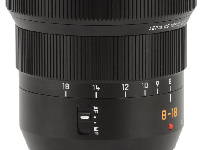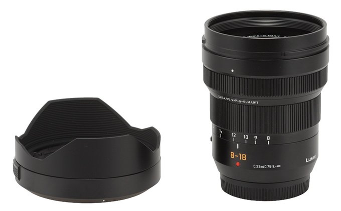 In the photo below the Panasonic Leica DG Vario-Elmarit 8–18 mm f/2.8–4 ASPH is positioned next to another Panaleica, the DG Summilux 12 mm f/1.4 ASPH, and the Olympus M. Zuiko 45 mm f/1.8.