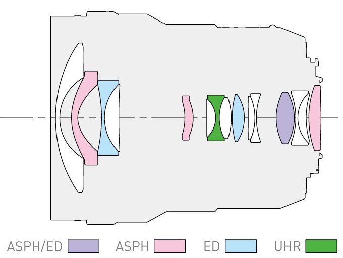 When it comes to the optical construction you deal here with 15 elements positioned in 10 groups. As shown in a diagram below the producer weren’t skimpy with special elements: you get three aspherical elements, two made of low dispersion ED glass, one UHR element, made of glass with ultra high refractive index, and one element which is both aspherical and made of ED glass. Inside you can also find a round aperture with nine diaphragm blades which can be closed down to a value of f/22.