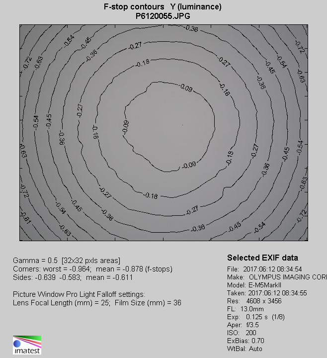 In the case of a difficult combination of the 8 mm focal length and the f/2.8 aperture you have to take into account a loss of light in the corners of 34% (−1.21 EV). That value is only seemingly high. Many lenses dedicated for bigger sensors, being slower than the Panaleica tested by us, have had vignetting of 50-70%. Compared to that the tested lens fares really well.