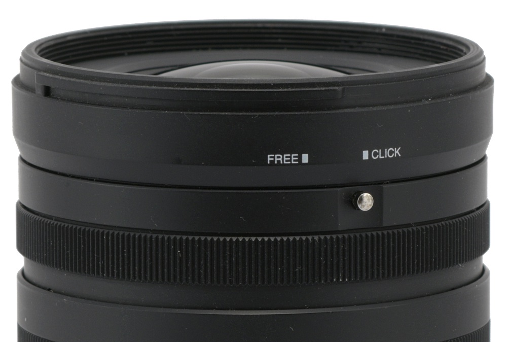 Further on you see an aperture ring, only 6 mm in diameter, moving every 1/3 EV step. Right behind that ring there’s a part of the tube which doesn’t move; it turns smoothly into a hood mount. In this part of the lens you also find a switch which enables you to choose among two aperture ring modes: clicked or clickless.