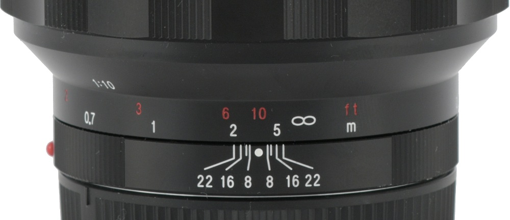 A comfortable manual focus ring is the biggest part of the lens’s body. Its middle is covered by thick ribbing with wide indents for fingers. The ring moves evenly without any play and is properly damped; running through the whole distance scale takes a turn through an angle of as much as 310 degrees. Most of that range covers the macro area, though; the change from 0.5 of a meter to infinity needs a turn through an angle of just 100 about degrees. Still it is more than enough to set the focus comfortably.